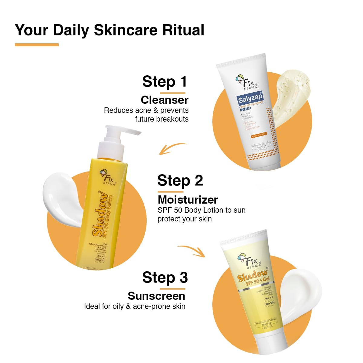• DIRECTIONS FOR USE: Squeeze desired amount of Fixderma Shadow SPF 50+ Gel on fingertips and apply over entire face, neck, and chest 15 min prior to sun exposure. Re-apply after swimming, sweating, physical activity or as needed.