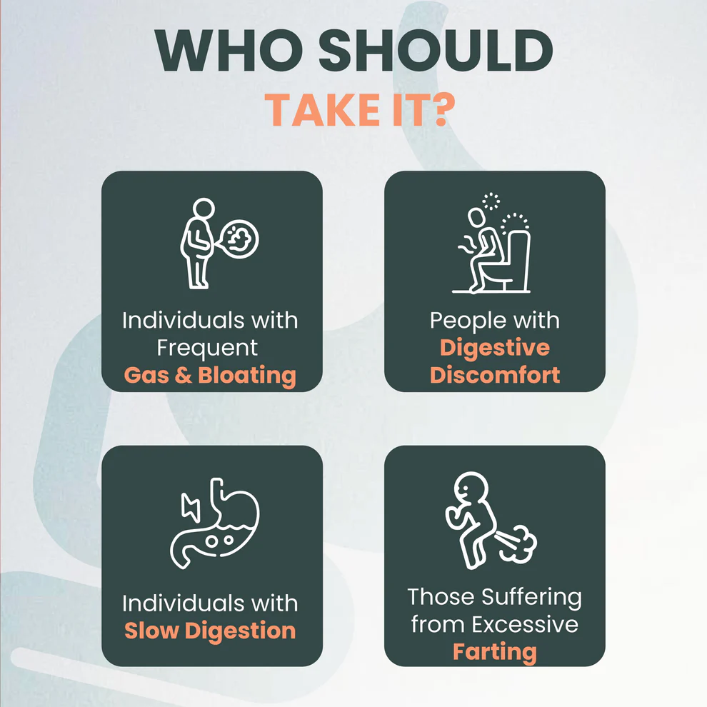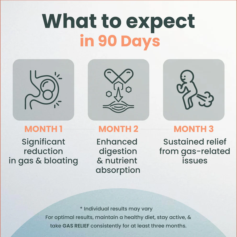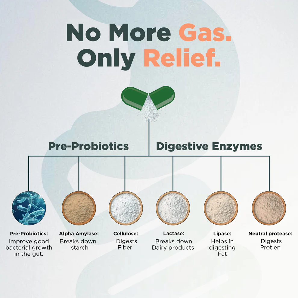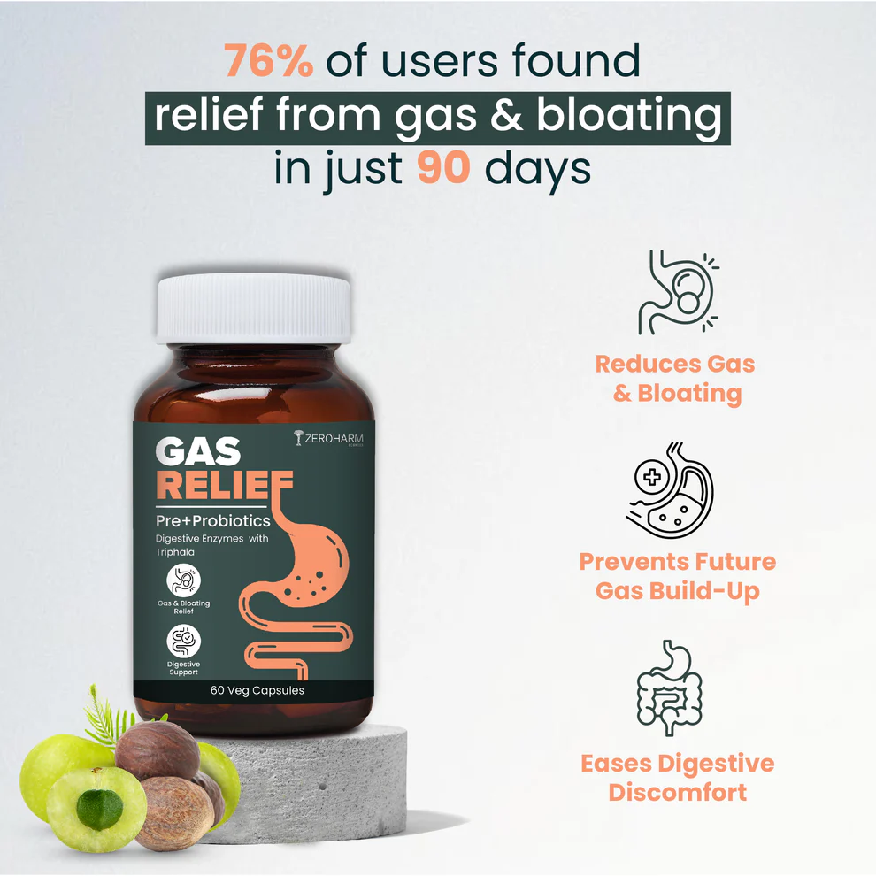 Experience relief with our gas relief capsules, formulated with advanced nanotechnology for 100% bioavailability. Our capsules effectively reduce gas and bloating, ease digestive discomfort, prevent future gas build-up, and reduce excessive farting. With zero side effects and trusted by over 300,000 happy consumers, enjoy a comfortable and gas-free life today!