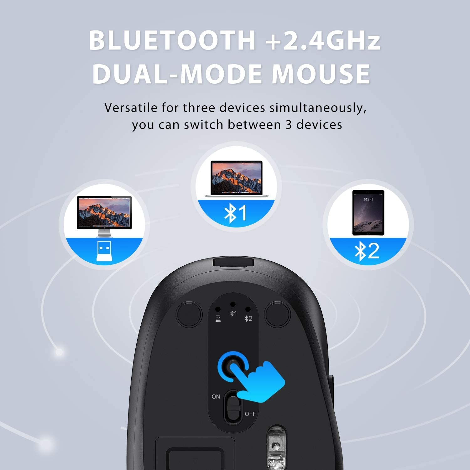 • 【MULTI-DEVICE CONNECTIONS】Both keyboard and mouse are dual-mode designed and three channels enabled(Bluetooth channel *2 + 2.4GHz USB channel *1). Effortlessly realize quick and smooth switch between 3 devices by pressing a single button.