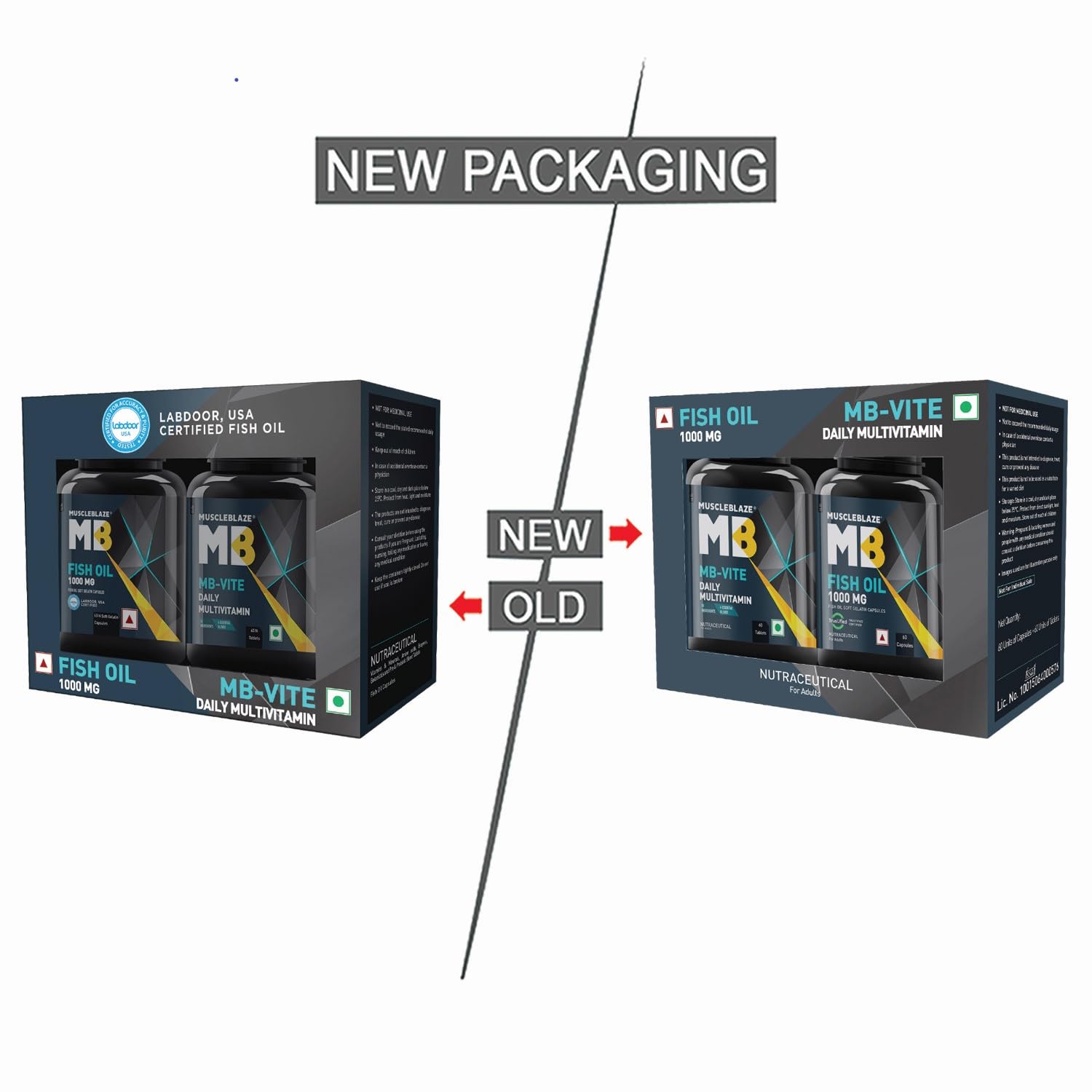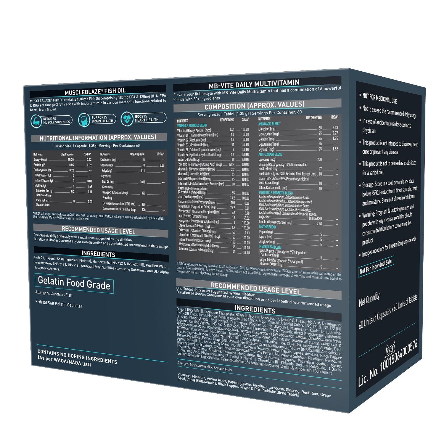 Details: This fish oil and multivitamin combo includes MuscleBlaze Omega 3 Fish Oil 1000 mg and MuscleBlaze MB-Vite Multivitamin.