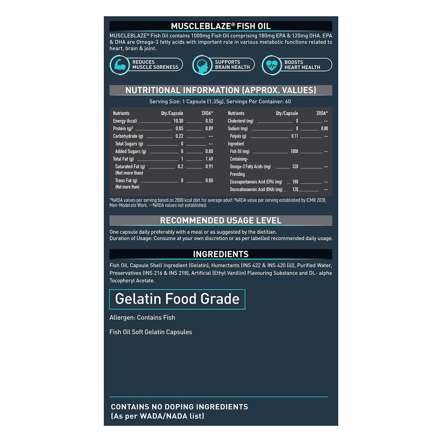 • LABDOOR CERTIFIED FISH OIL: MuscleBlaze Omega 3 Fish Oil 1000 mg is now India’s first & only certified Fish Oil for Purity & Accuracy by the reputed lab Labdoor, USA. It comes with accurate label claims with each omega 3 fish oil capsule providing 180 mg EPA & 120 mg DHA