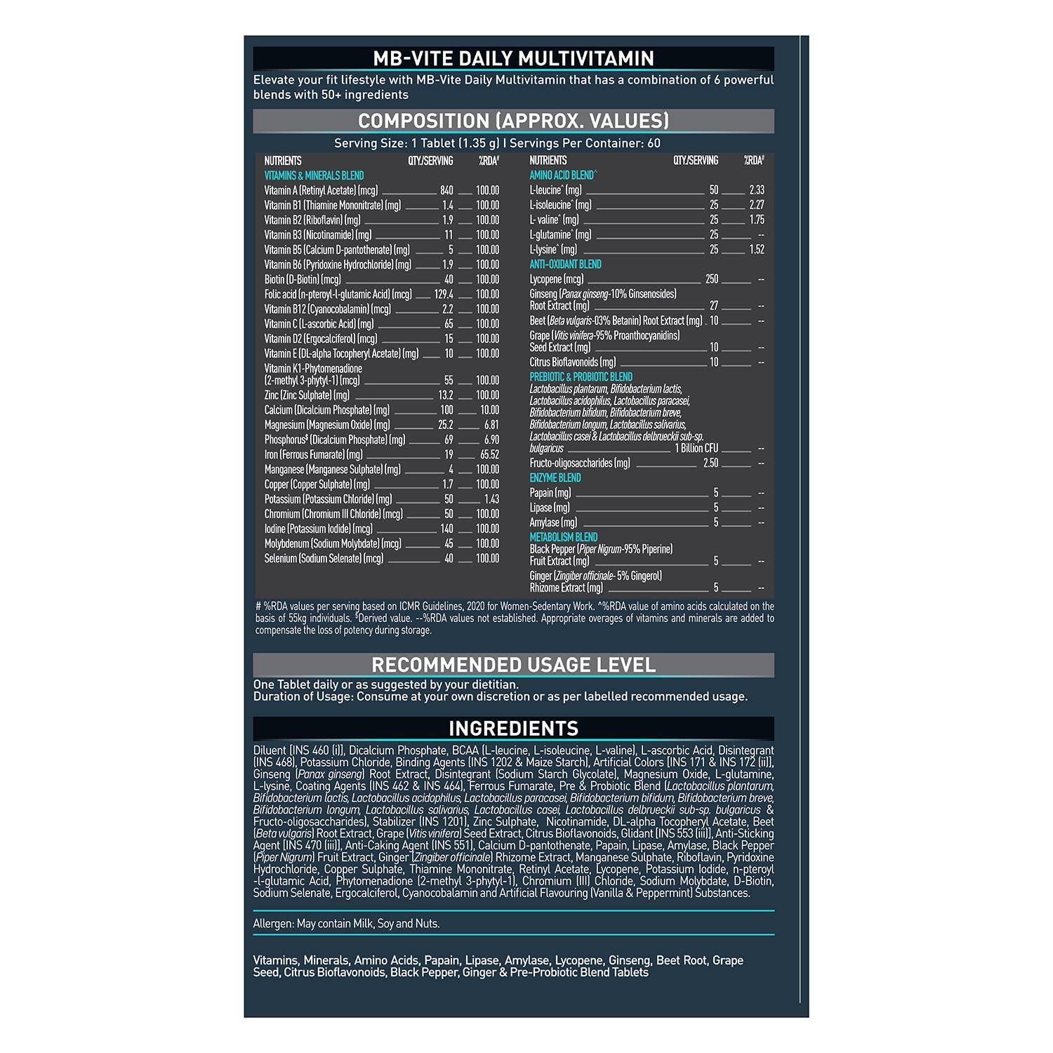 MuscleBlaze MB-Vite Daily Multivitamin just got better and stronger with the same premium quality but an even better formulation. This multivitamin pack has all your essentials with 6 unique blends & 50+ ingredients to upkeep key micro-nutrients and amino acids in your body. These multivitamin tablets are formulated for athletes and fitness enthusiasts to help boost immunity, fill nutrient gaps, enhance energy, build stamina, support recovery, and metabolic processes. The vitamins & minerals, amino acid, prebiotic & probiotic, enzymes, antioxidant and metabolism blend helps elevate your fitness & stamina. These daily multivitamin tablets are made with premium ingredients that are FSSAI & HACCP certified which ensures great quality and safety. Take 1 multivitamin tablet a day with water, preferably with a meal.