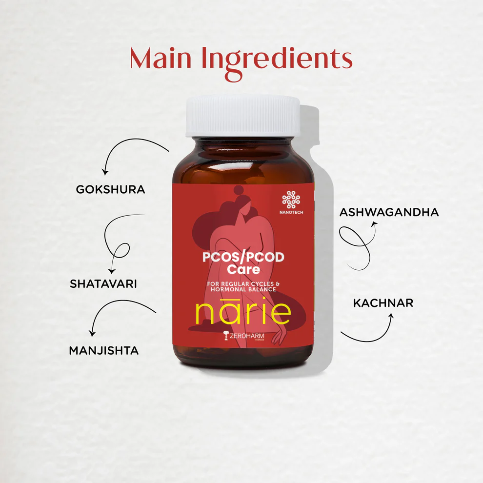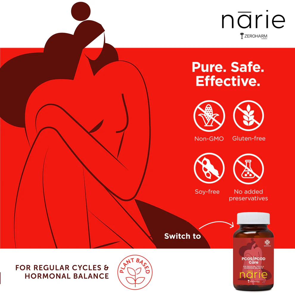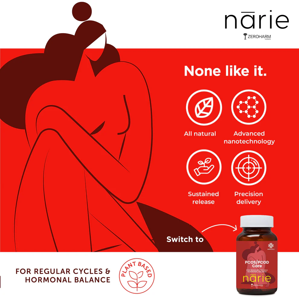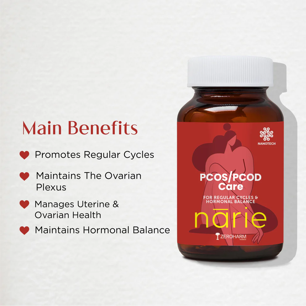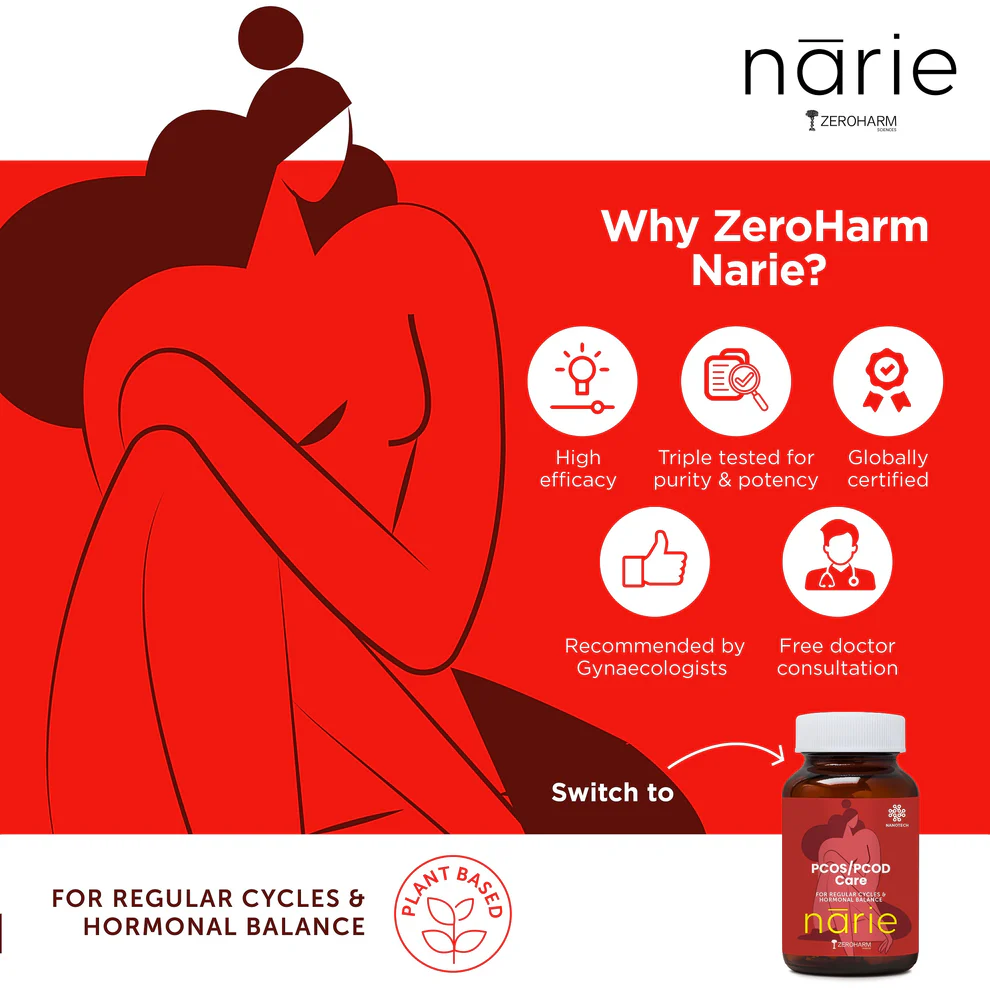 Narie PCOS/PCOD Care by ZeroHarm Sciences helps restore hormonal balance, manage weight, enhance fertility, reduce acne and facial hair, address fibroids, and improve ovulation in PCOS/PCOD