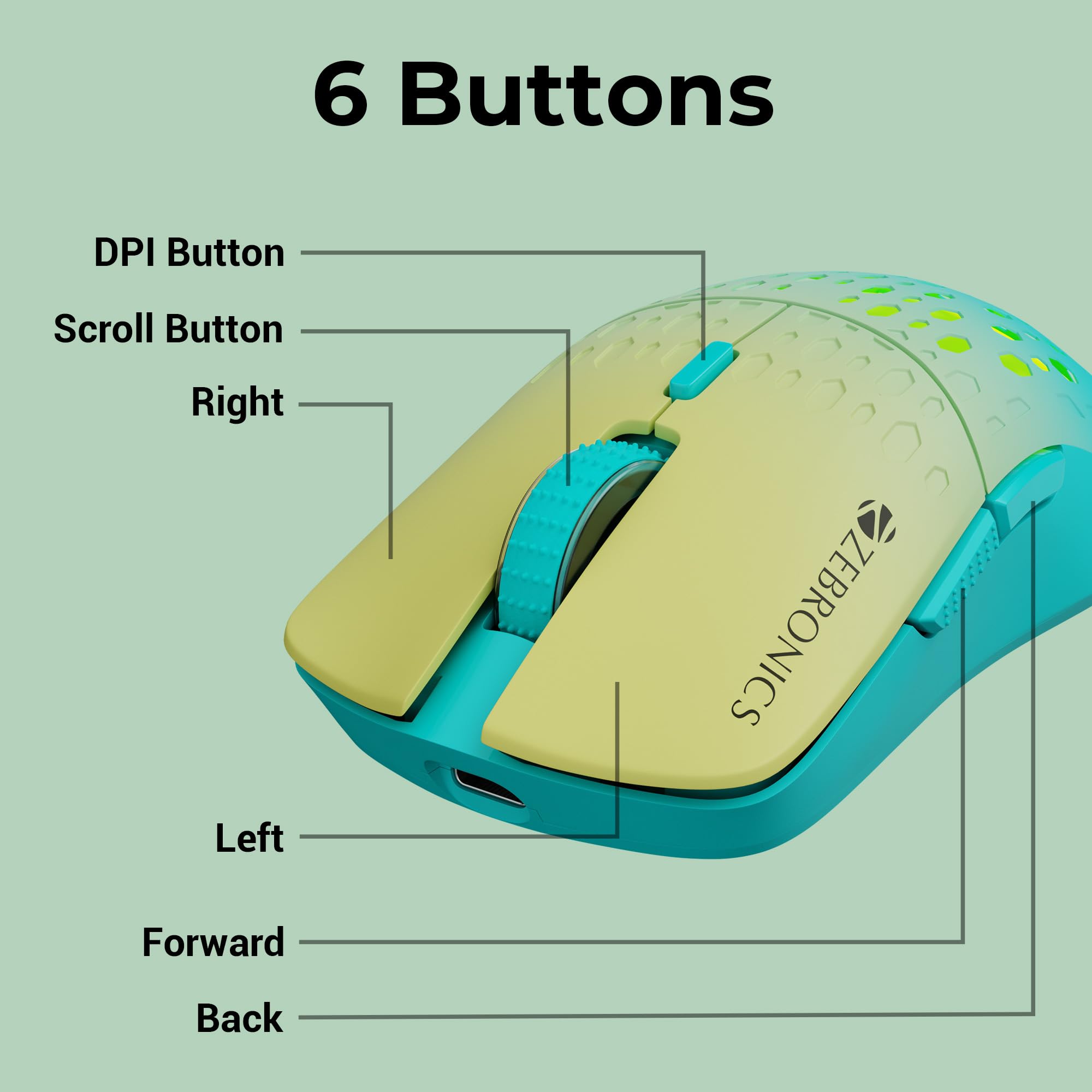 Introducing the ZEB-Marine Wireless Gaming Mouse—a sleek powerhouse offering seamless transitions between 2.4GHz and Bluetooth modes, dynamic multicolor LED lights, and a clutter-free setup with the nano receiver. With 6 buttons, an adjustable DPI, and a power on/off switch, it delivers precision and control during your gaming spree. This mouse ensures extended comfort with its ergonomic design, while the built-in rechargeable battery promotes sustainability, making it a must-have for gamers seeking a blend of style, and performance in a compact package