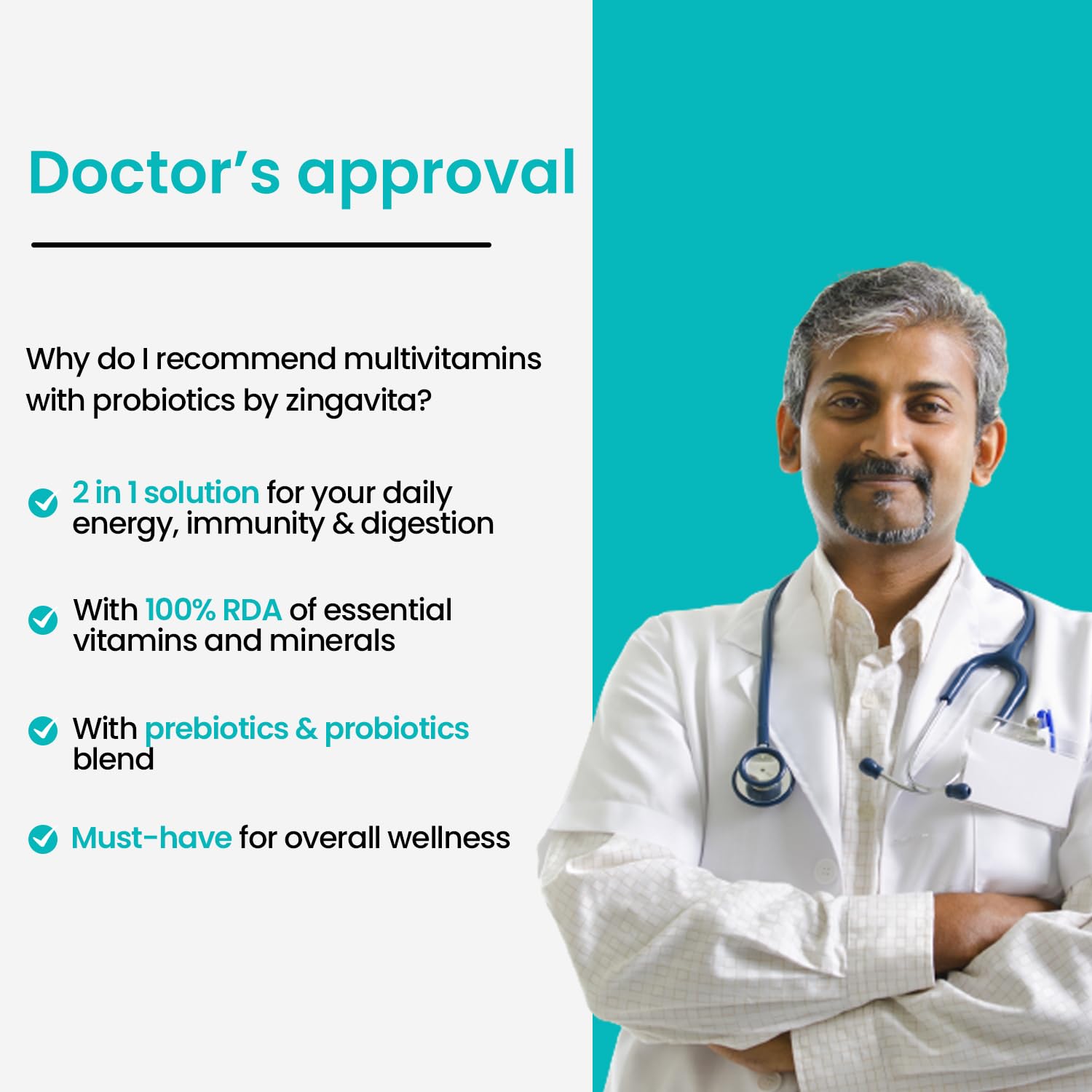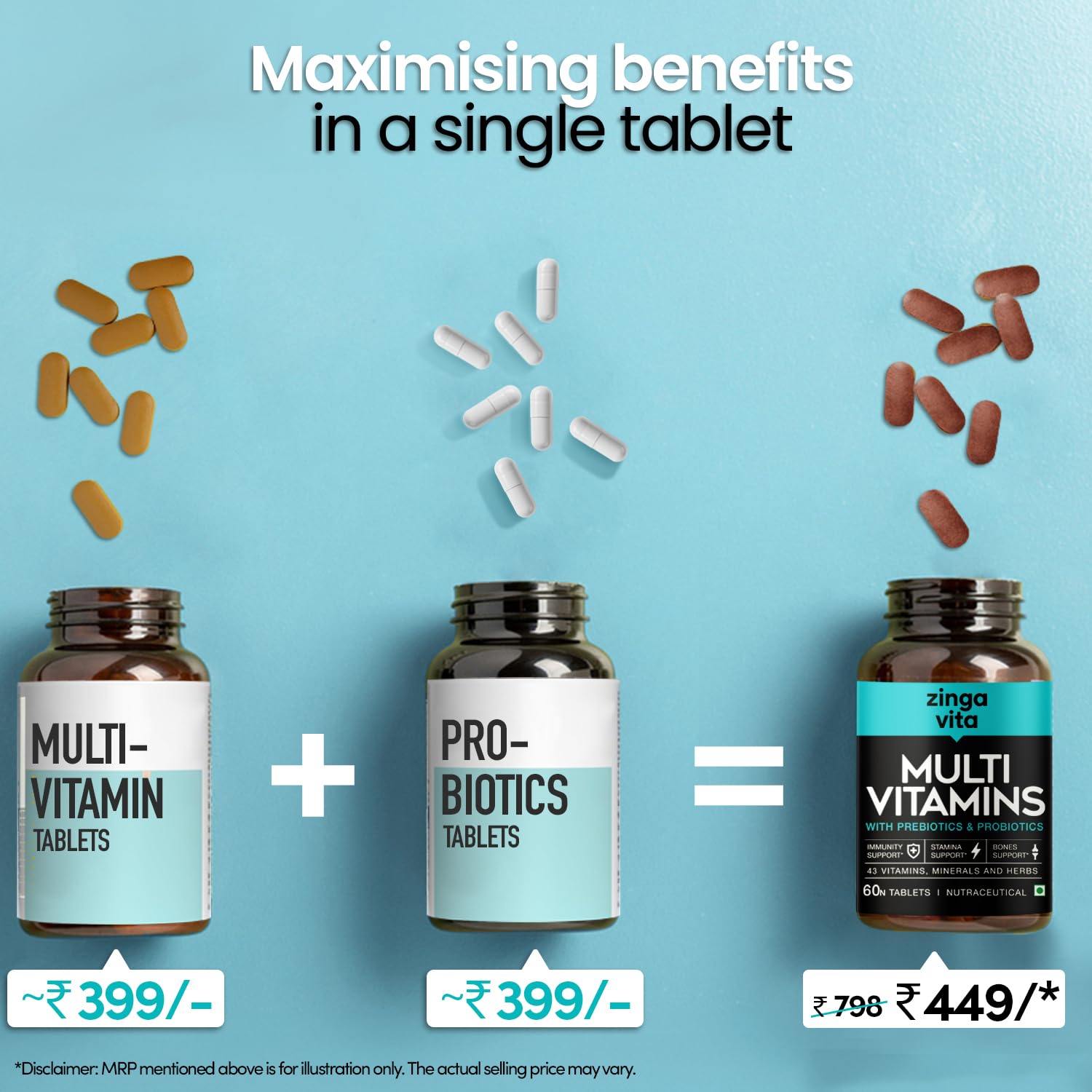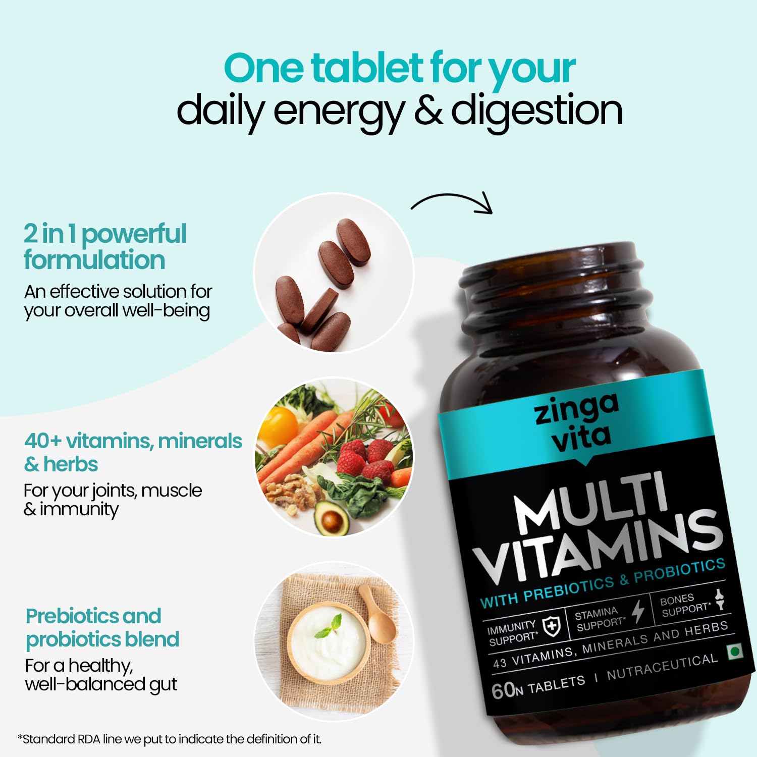 - POWER-PACKED NUTRITION WITH 100% RDA OF MULTIVITAMINS AND MINERALS: The go-getter in you deserves all the nourishment you can get. But your daily diet sometimes falls short of optimum nutrients. Zingavita Multivitamins with Prebiotics and Probiotics contains 100% RDA of all the major vitamins & minerals including Vitamin A, D, E, K, and B-complex vitamins.