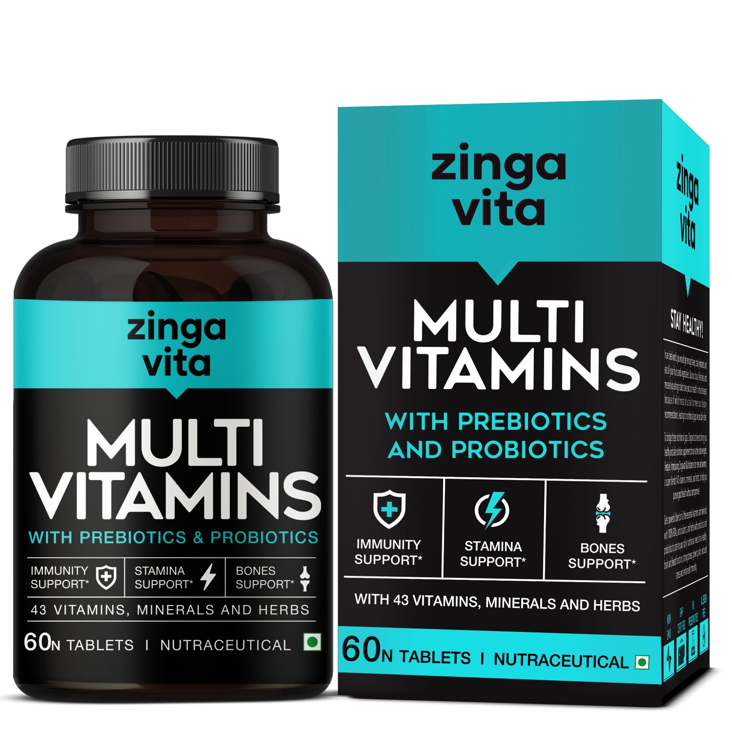 Details: In an ideal world, you would get enough sleep, stay hydrated, and eat all your fruits and vegetables. But our busy lifestyles and messed-up eating habits have put our health in the backseat because of which most of us fail to meet our dietary recommendations, leading to nutritional gaps in our daily diet. Get a powerful blend of all the essential vitamins and minerals with 100% RDAs, antioxidants, and herbs with prebiotics and probiotics to cater to your daily nutritional needs for a healthy brain and heart function, strong bones, glowing skin, reduced stress and enhanced immunity. To bridge these nutritional gaps, Zingavita strives to bring you healthy and safe nutrition supplements for an active and energetic lifestyle. Introducing Zingavita Multivitamins for men and women, a super blend of 43 vitamins, minerals, and herbs, to help you pursue good health without compromise! Get a powerful blend of all the essential vitamins and minerals with 100% RDAs, antioxidants, and herbs with prebiotics and probiotics to cater to your daily nutritional needs for a healthy brain and heart function, strong bones, glowing skin, reduced stress and enhanced immunity